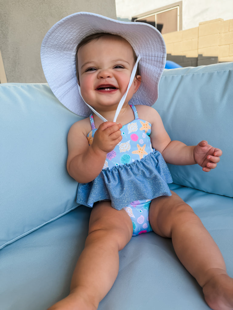 The girl’s peplum swimsuit is a two-piece set that comes with a peplum top and reversible bottoms.