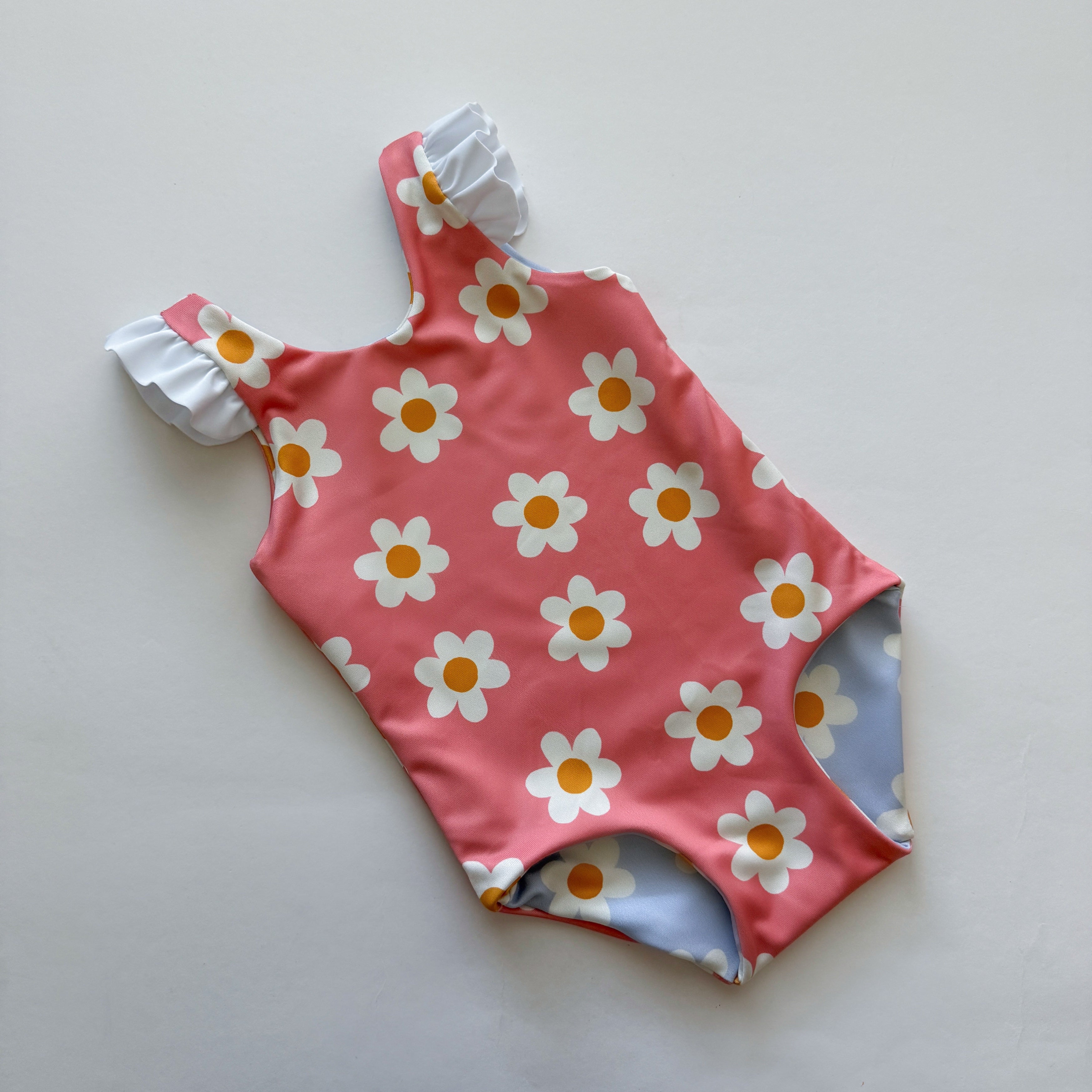 Reversible one piece suit with ruffle sleeves. This one-piece girls swimsuit is almost as cute as your little one! Whether your little bundle of joy is a newborn or a crazy toddler, this swimsuit is perfect for looking stylish while toughing it through all the water activities you can think of! Made from high quality lycra stretch fabric, with only the softest material for your child's delicate skin, these bikinis are made to last.
