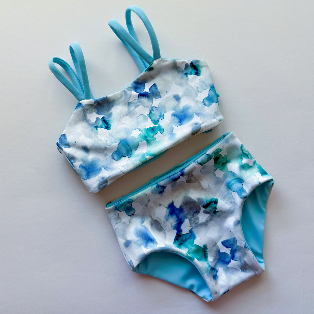 The girl’s swimsuit is a two-piece set that comes with a reversible top that has adjustable straps that tie in the back and reversible bottoms.