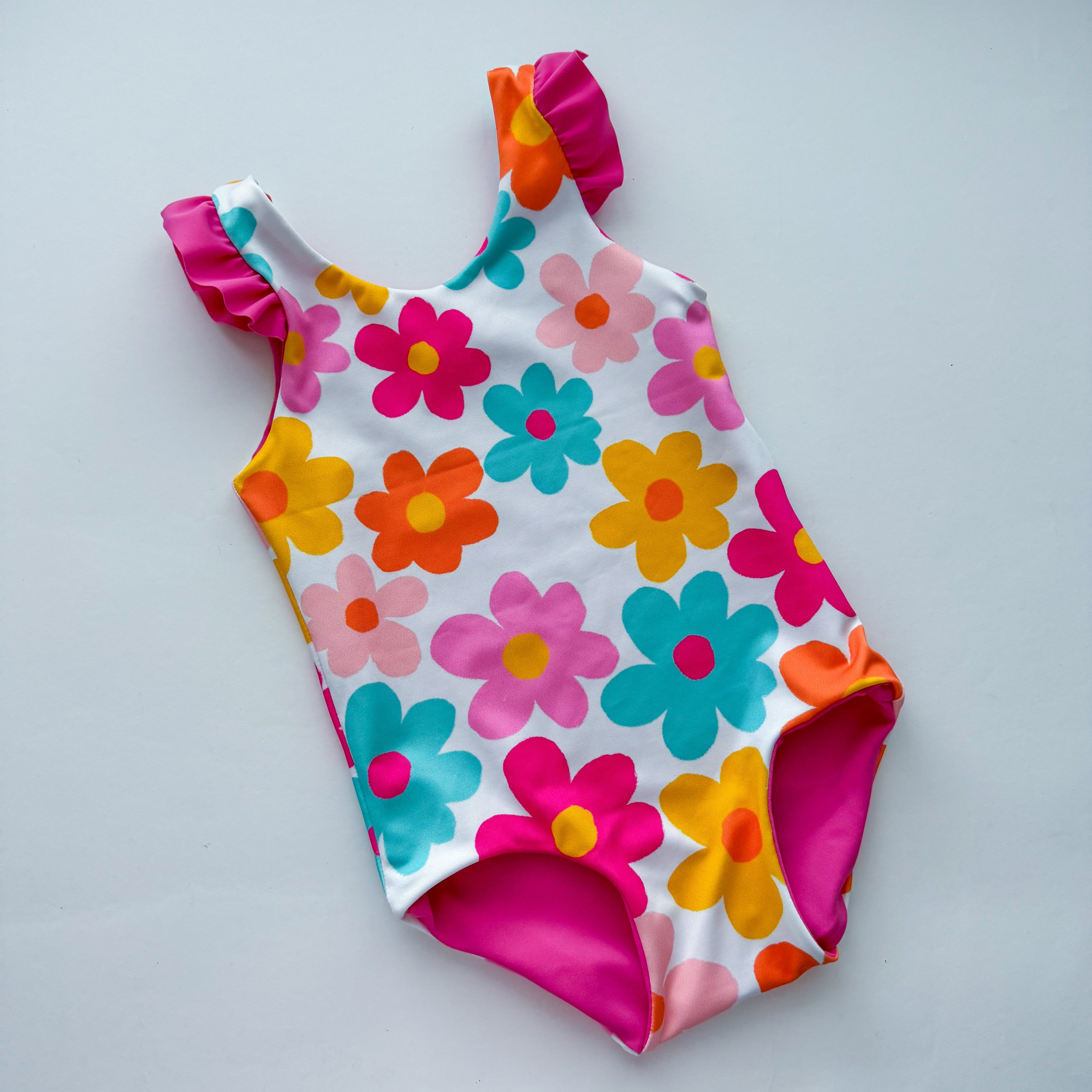 Reversible one piece suit with ruffle sleeves. This one-piece girls swimsuit is almost as cute as your little one! Whether your little bundle of joy is a newborn or a crazy toddler, this swimsuit is perfect for looking stylish while toughing it through all the water activities you can think of! Made from high quality lycra stretch fabric, with only the softest material for your child's delicate skin, these bikinis are made to last.